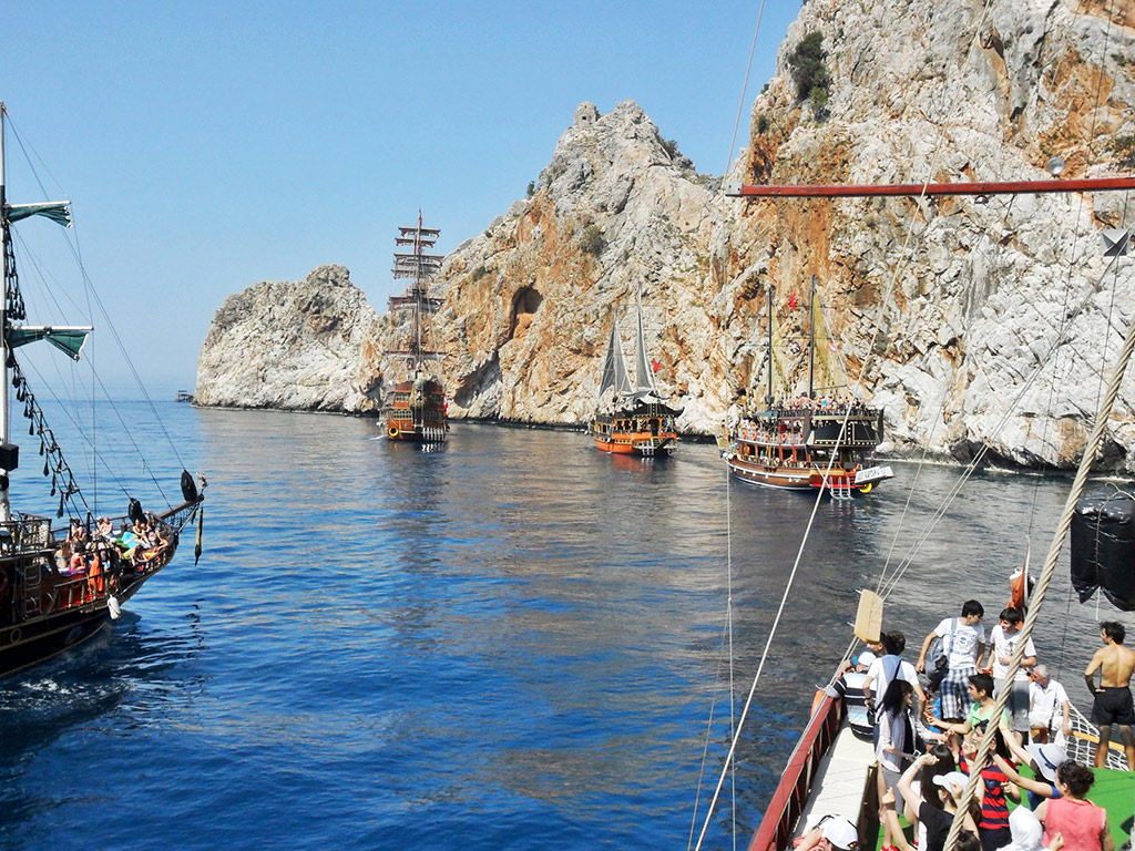 In the afternoon it’s time for the boat trip, a perfect opportunity to wash off all the dust accumulated during the jeep safari by swimming in the crystal turquoise waters of the Mediterranean Sea. A tasty lunch is served on board and there’s plenty of time to relax, enjoy the views of the ancient shipyard of Alanya and the three famous caves; Phoshphorus, Pirate and Love Cave.
