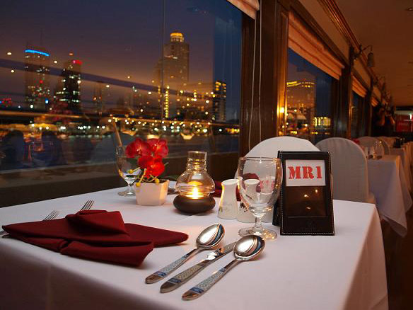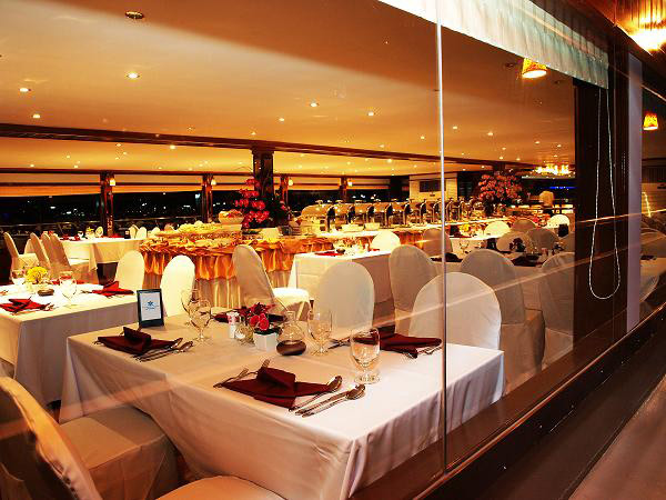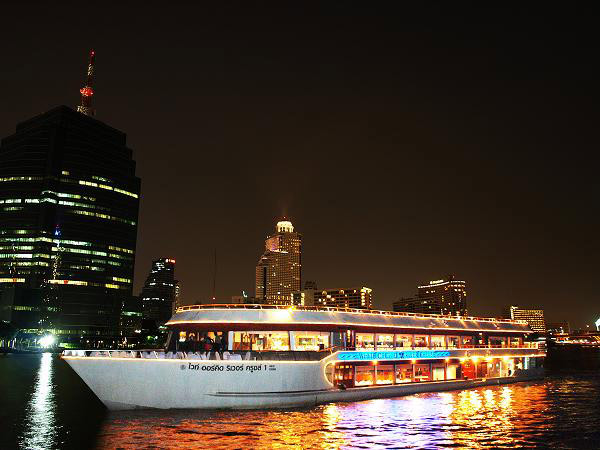 A visit to Bangkok wouldn´t be complete without a cruise along the Chao Praya River. What can be better than floating along the river enjoying a relaxing and delicious evening dinner, with the cityscape glittering in lights exuding romance, the experience becomes even more magical A visit to Bangkok wouldn´t be complete without a cruise along the Chao Praya River. What can be better than floating along the river enjoying a relaxing and delicious evening dinner, with the cityscape glittering in lights exuding romance, the experience becomes even more magicalHighlights- Enjoy a delicious buffet dinner - Live music - Incredible views of the cities most famous landmarks Board a large boat and get ready to glide along the waters of Chao Praya, while savoring exquisite traditional Thai dishes and international cuisine. Why not try a delicious cocktail prepared by the waiters or even indulge in a glass of fine wine from some of the world’s greatest vineyards.