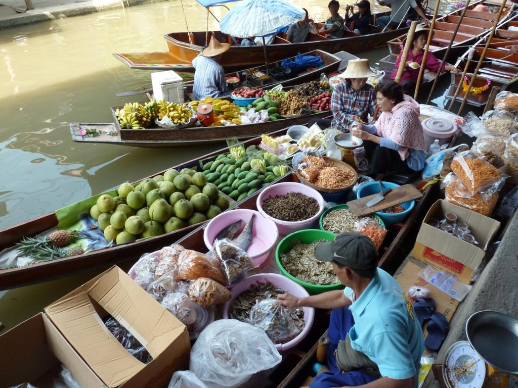 Experience the colourful market and watch the merchants as they paddle along the congested canals in sturdy canoes laden with fresh fruits and vegetables to sell to shoppers on the river bank.