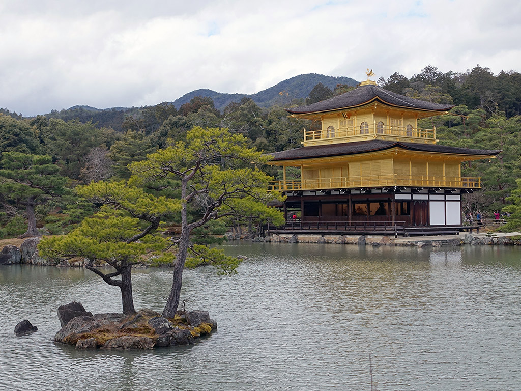 Kinkaku-ji Temple, a World Heritage Site, also is known as the Golden Pavilion. The wooden architecture is covered in thin layers of pure gold and is surrounded by a beautiful lake.