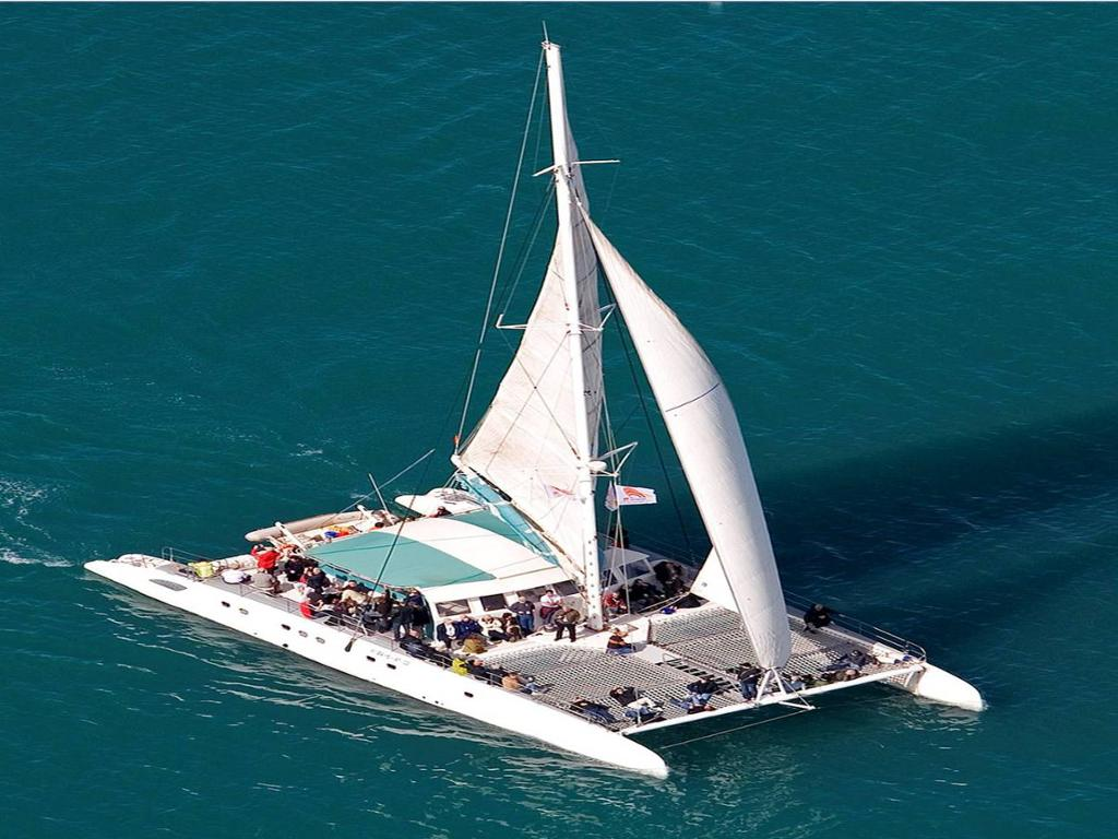 The catamaran sailing near the coast will make a stop to enjoy a refreshing swim at sea.