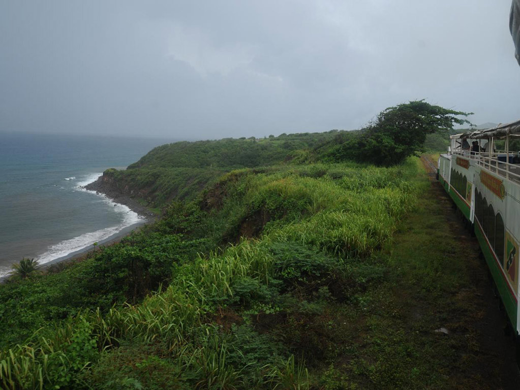 While heading north along the coastline, the train rolls across tall steel bridges spanning deep canyons, and winds through small villages and farms. The high volcanic cone of Mt. Liamuiga rises above the railway, skirted by light green fields of cane and, higher up, by dark green rainforests.