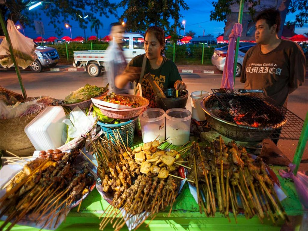 After dark, the street stalls fire up their grills and start cooking. Take a walk through Sihom, an area of small stalls selling cheap but tasty snacks. Wander from stall to stall stopping to taste items such Lao-style donuts, bowls of steaming noodles and pork meatball wraps.