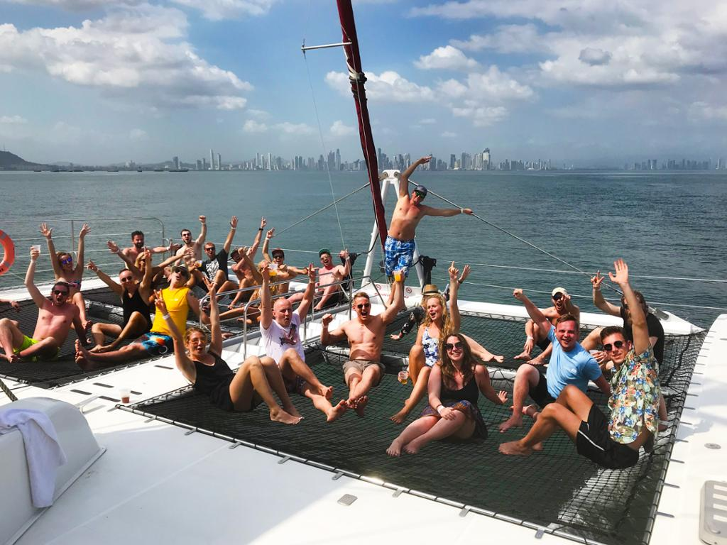 Enjoy the breathtaking views of the Panama city skyline, Cinta Costera and ships waiting to cross Panama Canal, until you reach the Island of Taboga on a 45 minutes ride; During this time light snacks will be served. After reaching Taboga we sail to the back side of the Island, our secret spot, an amazing bay with beautiful natural views, where you will have the opportunity to jump off the boat and have your first swim! We also have a stair with direct access to the water. Climb back into the boat to enjoy a cold beer while we sail to the main side and make our second stop on the town side, where you'll be provided with transportation to the beach and be able to visit the small village of Taboga. You can also relax in the catamaran's big nets, enjoy the sun, swim or use our floating noodles. You will be able to jump from the boat to the water too. After the town visit, lunch will be served on board of the catamaran and later, we'll sail back to port. If the wind is favorable during our way back the sails will be opened and the party continue.