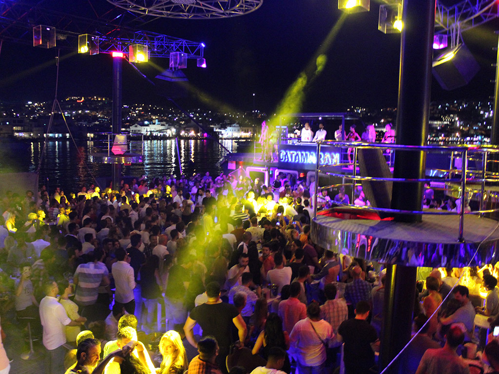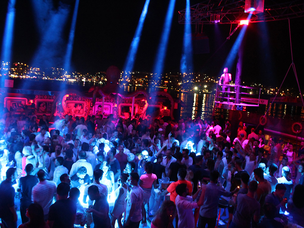 After 10 pm, on the port, among the Turkish and foreign visitors sipping their first drinks prepared by the master barmen and barmaids are frequently the stars of the television, cinema, music and jet set circle. As the rhythm of the night and music picks up speed around past midnight, the party people get ready to groove whole night on the transparent dance floor just above the fishes, and they start to leave the port to flock the boat. The party boat leaves the shore with its four bars in different concepts, VIP booths, customary dance shows, glamorous dancers and famous DJs and the night gets fired up and the dance aboard begins.